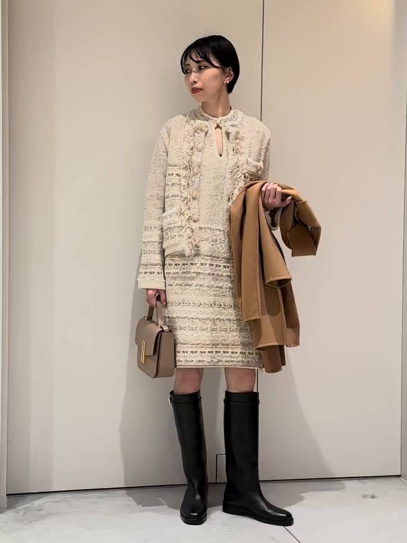 『セットアップコーデ』 繊細なツイード素材が上品さを引き立てる、こちらのセットアップはBOUSSOLE(ブソル)のもの🧶 柔らかいベージュ系の色味はキャメルのコートと相性抜群で、ツイードジャケットもカーディガンのように軽やかに羽織れるため、上からコートを重ねてももたつかずしっかり防寒できます☃️ COLUMNのキャメルコートは、ジャケットのようなきちんと感とコートの温もりを兼ね備えた一着🧥 ややオーバーシルエットなので、中に着込んでも着膨れしにくく、厚手アイテムとのレイヤードも綺麗にまとまります。 軽い着心地でストレスなく着られるのも嬉しいポイントです🌟 ひざ丈のワンピースは短すぎず、品よく着られる絶妙なバランス。 柔らかなワントーンのスタイルにメリハリを出すため、足元は黒のロングブーツを合わせました。 冬のお出かけや、今時季のホリデーシーズンにもぴったりのコーディネートです🎅🎄✨ 店頭でも展開しております。お気軽にお立ち寄りくださいませ。 ASSEMBLEESTNATION GINZASIX店 TEL:03-6264-5553 営業時間:10:30-20:30