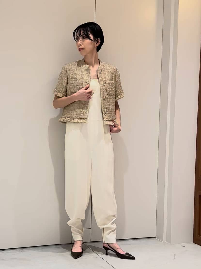 『オールインワンコーデ』 ゴールドツイードのショートジャケットと、 白のオールインワンはどちらも ESSENCEOFLUXURY のアイテム。 上品な光沢のあるツイードジャケットは羽織るだけで華やかさがあるのでアクセサリー要らずです。 オールインワンは上品な見た目でも、フロントジップで脱ぎ着がスムーズ。内側からウエストを絞ることも可能なデザインとなっています。 日常でも特別なシーンでも、ストレスフリーに着られるのが嬉しいポイント💡 裾はカフス仕様になっているため、引きずらずスタイルよく着られます。 ゴールド × ホワイトの配色で、女性らしさと上質さを兼ね備えた大人のワントーンコーデです👑🤍 店頭でご覧いただけます。お気軽にお立ち寄りくださいませ。 ASSEMBLEESTNATION GINZASIX店 TEL:03-6264-5553 営業時間:10:30-20:30