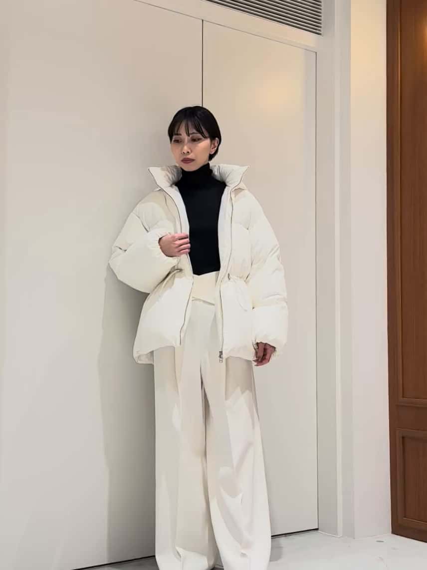 『冬のホワイトコーデ🤍』 こちらの軽くて暖かいホワイトダウンは PaDD のもの。 中綿にダウン90%・フェザー10%を使用しており、見た目以上に軽くふかふかと空気を含んだ暖かさが魅力です🪽 ホワイトでも膨張して見えにくく、ウエストを絞ることで上品なボリューム感に仕上がります🐻❄️ またフードは着脱ができ、スポーティにもミニマルにも対応する万能アウター。 中にパーカーを重ねる日はフードを外すと、首まわりがすっきり見えてバランス良く着られます。 ダウンのボリューム感や白の膨張色に対して、黒のタートルを合わせてメリハリをプラス🖤 ボトムスにはホワイトのワイドパンツを合わせました。ウエストのクロスデザインがアクセントになり、落ち感のあるシルエットが、スタイルをよりきれいに見せてくれます。 冬はアウターが暗い色に偏りがちですが、明るいトーンでまとめることで顔まわりが華やかに。 クリーンで女性らしい冬のホワイトコーデです❄️ 店頭でもご覧いただけます。 お気軽にお立ち寄りくださいませ。 ASSEMBLEESTNATION GINZASIX店 TEL:03-6264-5553 営業時間:10:30-20:30