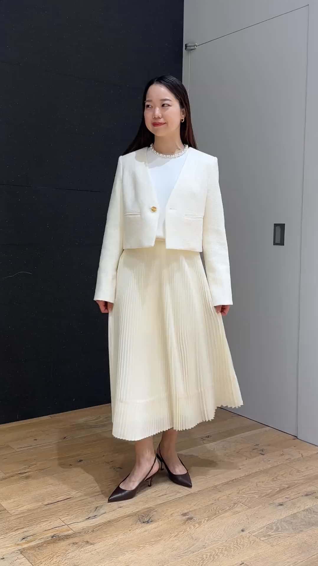 セレモニーや式典を意識したコーデです✨ セットアップではないですが、ワントーンコーデで統一感を出して、普段単品でも使いやすいアイテムでコーデ組みしました! まずインナーの、パールネックニットは去年も人気があった銘品です。 今年はパールが大小ランダムな配置で、更にオシャレ感がアップしています。 ボトムスのプリーツスカートは、 小柄な方でも履きやすい丈感がポイントです! 軽やかなアコーディオンプリーツで、履いた時の揺れ感がとても上品✨ シンプルなアイテムなので、普段の着用でもヘビロテできそうです。 ジャケットには、ショート丈のツイードジャケットを合わせました。 単色で凹凸感も控えめなツイードなので、 華やかすぎずカジュアルなデニムスタイルにも合わせられそうです。 是非お試しくださいませ。