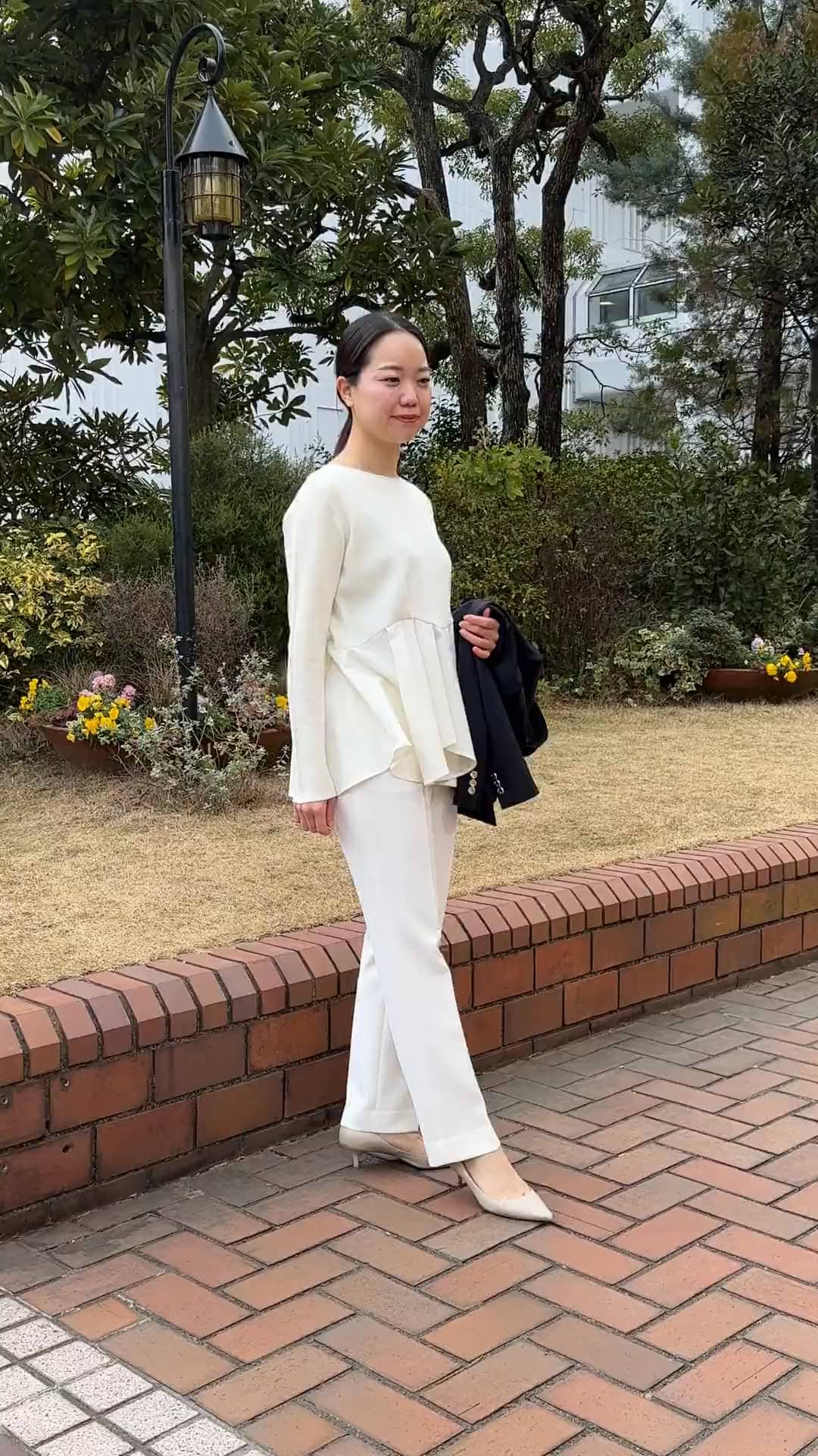 セレモニー、オフィススタイル〜普段まで✨ 着まわし力抜群のアイテムを使って、 コーディネートしました! トップスは、着回し重視でペプラムデザインのプルオーバー。 ブラウスはあまり普段着用しない、お休みの日にも気軽に着たい、そんな方におすすめです! アームホールのシルエットが少しゆったりしているので1枚で着用した時には程よい抜け感がでるデザインです。 ジャケットを羽織っても邪魔にならない程度のゆるさなのでご安心ください。 ボトムスは、美シルエット+ウエストゴムの着回し万能で履きやすさ抜群のパンツです。 34〜38サイズの3サイズ展開なので、体型にぴったりのものを選んべるのも嬉しいポイントです! 実はお揃いのブラウスもあり、セットアップでの着用も別の写真でご覧ください! ジャケットは、 エストネーション銘品として毎年人気のダブルブレストジャケット。 ネイビーに金ボタンのクラシックなブレザースタイルで、幅広いスタイルのコーディネートに合わせて羽織っていただけます✨ お尻が隠れる丈感で、少しマスキュリンな雰囲気があります。 青みが抑えられた上品なネイビーが、洗練された大人のコーディネートに仕上げてくれます。 是非お試しくださいませ。