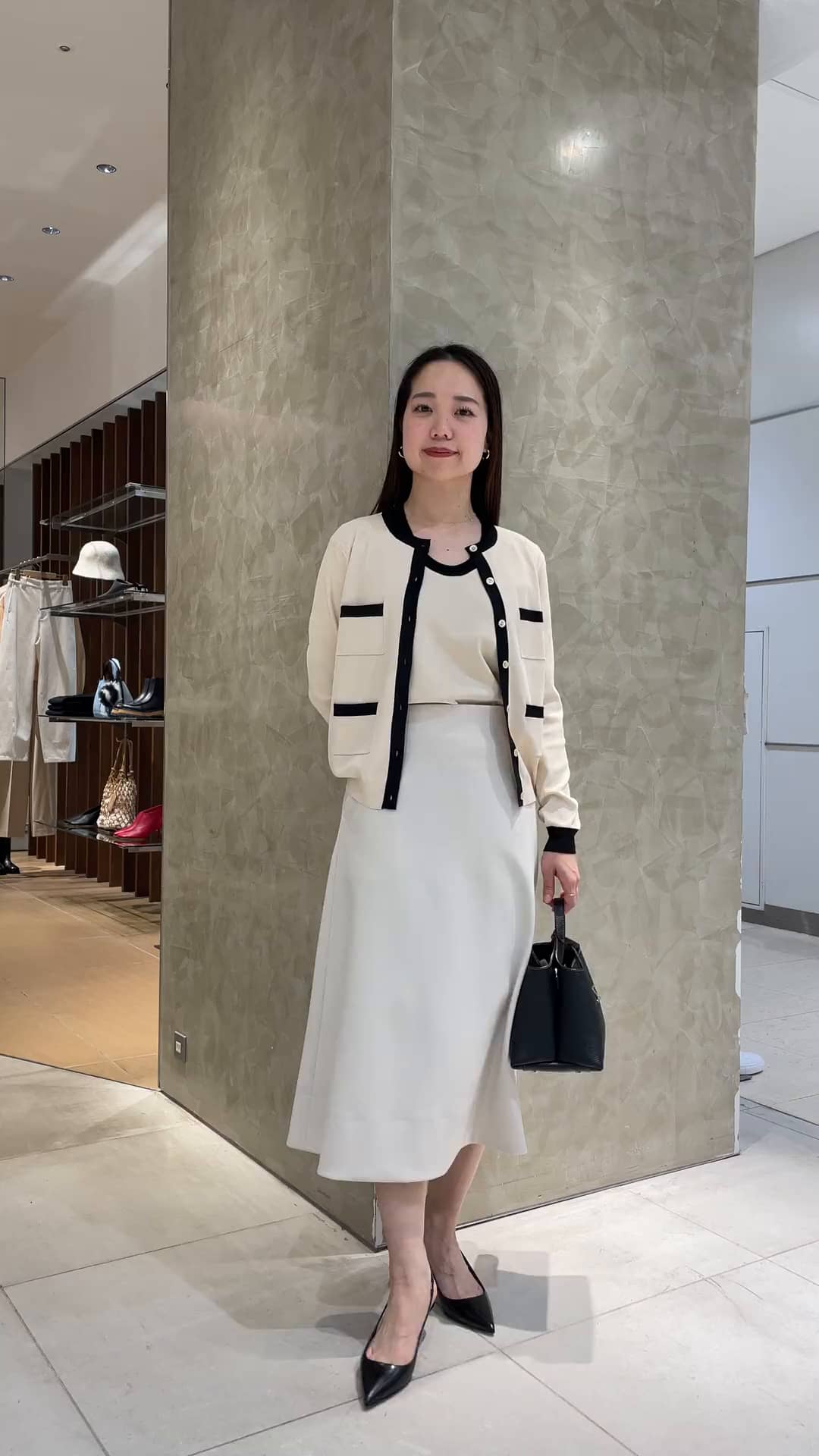 春を意識した好感度コーデ✨ ニットアンサンブルは、 上品な印象+悩みいらずの万能アイテムです。 インナーは半袖のUネックプルオーバー、 カーディガンは4つポケットデザインのコンパクトカーディガンです。 ジャケットのインナーとしてもOK 1枚でももちろんOK サラッとした梳毛ニットで夏まで重宝するタイプなのでセットであると大変便利です! フレアスカートは とてもシンプルなデザインで、フレアシルエットの美しさが際立っています。 私の身長でちょうどスネ辺りの着丈なので、長過ぎず低身長の方も綺麗に着こなせます。 程よく肉厚な生地でシワになりにくく、 身体のラインも拾いにくいです。 履き心地は軽やかなので、春夏のコーディネートに是非取り入れてください✨