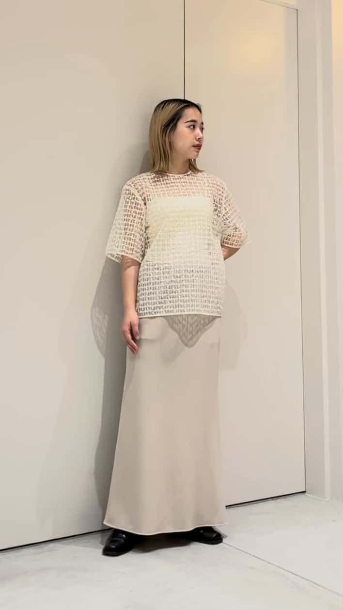 春らしさを感じさせるベージュのワントーンでまとめてみました。 着膨れ見えや、顔映りが気になりがちなワントーンですが、トップスの生地とバイヤススカートの生地感が異素材を楽しめみながら着やすいワントーンに仕上がっております◎ こちらもインナーは紐が華奢なタイプのカップ付きキャミソールを着用しております。 ロゴTシャツやシアーニットを重ねても可愛いと思います✨ ASSEMBLEESTNATION GINZASIX店 TEL:03-6264-5553 営業時間:10:30-20:30