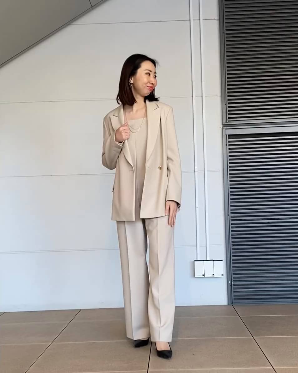 セットアップコーディネート ジャケットは程よくゆとりがあるので着用いただきやすいオススメな1着◎ サロペットは太すぎないパンツシルエットでカジュアルに見えすぎないです。 バックにベルトがあるのでインナー着用もしやすいです。 肌の色を選ばず、上品見えするベージュがオススメカラーです。 ------------------- サイズ・素材など商品詳細については掲載アイテムをご確認ください。 ルミネカードをお持ちのお客様は、ルミネカードWeb決済でのご案内が可能でございます。お電話かLINEからお問い合わせ下さいませ。 エストネーション横浜店 : 045-534-7128