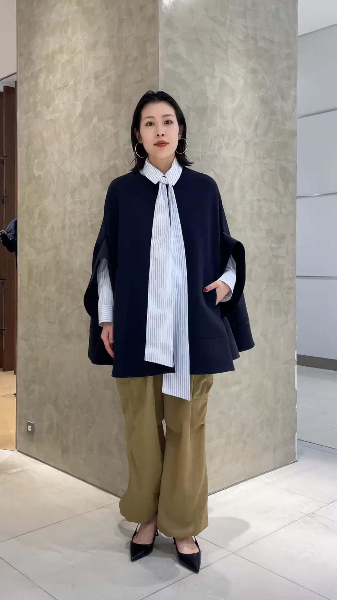 フォーマルな印象のケープコートにカジュアル要素をプラスしてデイリーに着回し。 カーゴパンツは程よいツヤ感があるので、きちんと感のあるアイテムと合わせていただいてもマッチします◎ ボウタイブラウスはあえて結ばず長めに垂らしたり、立体感のあるリボンにしたりとその日の気分でアレンジを楽しんでいただけます💡 足元はパンプスなどで女性らしい抜け感をプラスするとバランスが良いです。 【着用アイテム】 コート:ESTNATION(Fサイズ) シャツ:ESTNATION(36サイズ) パンツ:ESTNATION(36サイズ) シューズ:ESTNATION その他スタッフ私物