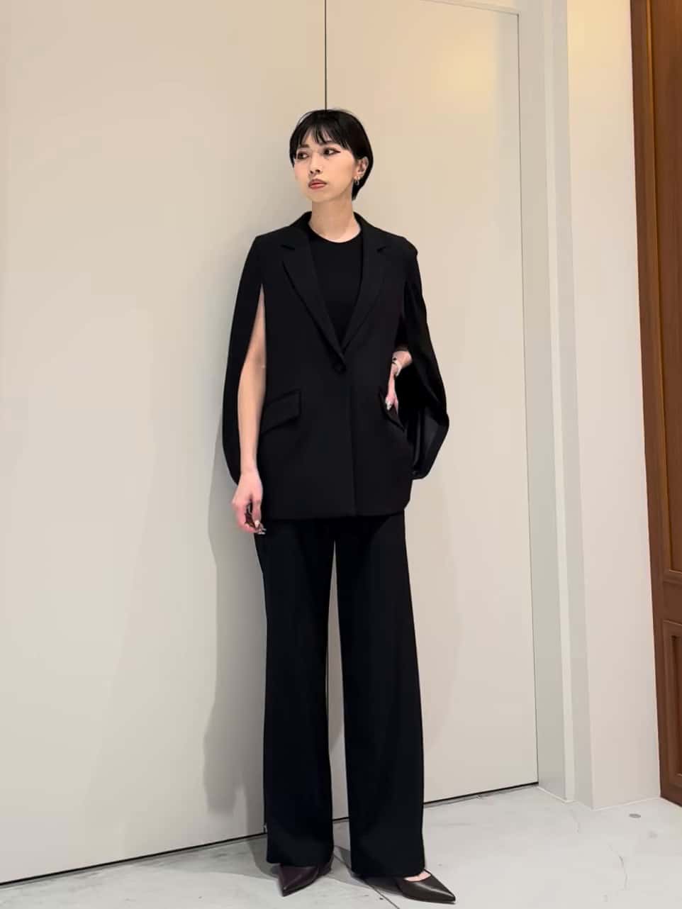 ESTNATION THE FIRSTのケープジャケットと センターシームパンツのセットアップ🖤 昨年もご好評いただいたシリーズが、今年も登場。 ホワイトとはまた違い、ブラックはよりシックでモードな印象に♠️ 洗練された雰囲気を引き立ててくれる一着です。 構築的なシルエットが際立つケープジャケットは、さらりと羽織るだけでモードな佇まいに。 立体的なフォルムが、シンプルながらも存在感を引き立ててくれます✨ インナーには同ラインのフロントスリットノースリーブを。あえて長袖をレイヤードすることでシーズンレスに着用でき、スタイリングの幅も広がります パンツは美しい落ち感とセンターシームで、縦のラインを強調。無駄を削ぎ落としたデザインに、ゴールドジップがさりげないアクセントに🪄 セットで着るだけで、洗練されたワントーンスタイルが完成します♣️ GINZA SIX店では3/26(木)より店頭にてご覧いただけます。 お気軽にお立ち寄りくださいませ☆ ASSEMBLEESTNATION GINZASIX店 TEL:03-6264-5553 営業時間:10:30-20:30