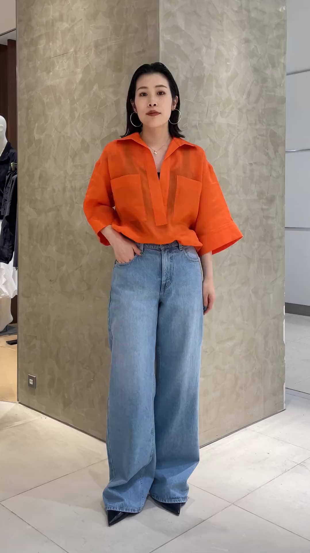 4/9(木)発売のシャツを使用したスタイリングです。 夏らしい鮮やかなオレンジカラーが目を惹くリネン100%のスキッパーシャツ🍊 デニムを合わせるだけでスタイリングが完成するこれからの時期マストバイアイテムです。 Nailsには新型のワイドバギーが登場です♪ シルエットは太すぎず腰回りもすっきりしているので、カジュアルから綺麗めスタイリングの外しまで、幅広く合わせていただけます◎ 【着用アイテム】 トップス:ESTNATION(Fサイズ) パンツ:Nails(23サイズ) シューズ:ESTNATION その他スタッフ私物